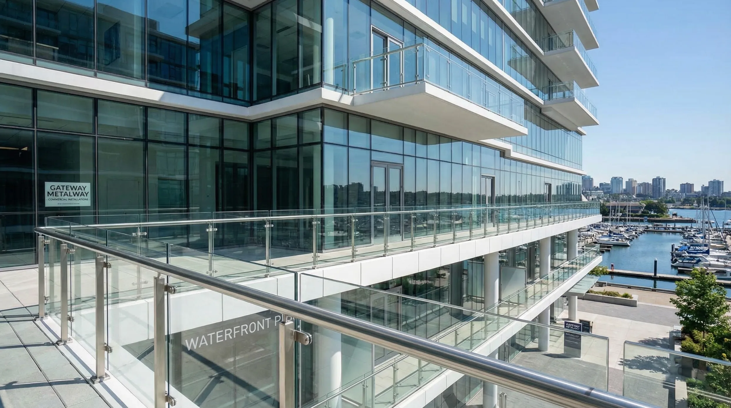 The developers of Waterfront Place, a new A-grade commercial office building in Century City, required a balustrade system that aligned with the building's modern design language. The architect specified frameless glass panels with stainless steel posts and handrails throughout the interior staircases and mezzanine levels. The exterior balconies required a marine-grade stainless steel solution to handle the salt air exposure from the nearby coastline.